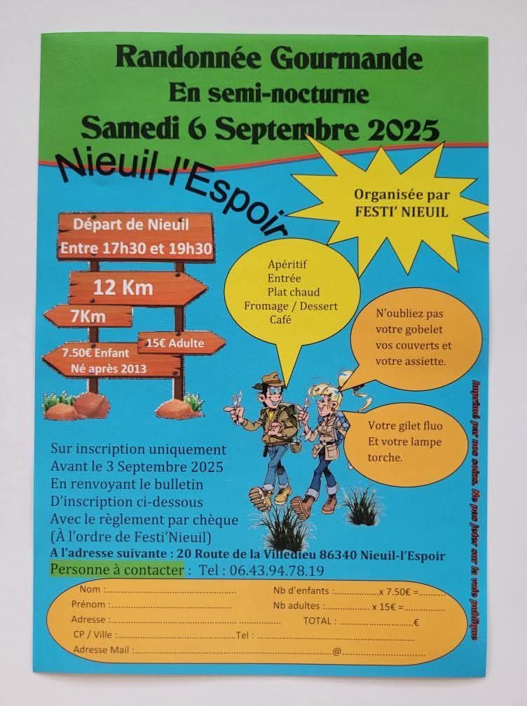 Départ de Nieuil l'Espoir entre 17 h 30 et 19 h 30. 7 ou 12 km.