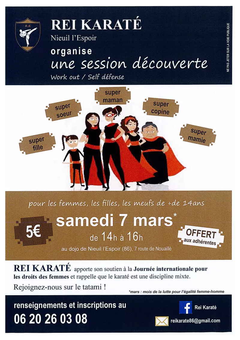 A l'occasion de la journée internationale pour les droits de la femme, Rei Karaté organise une session découverte spéciale filles le samedi 7 mars de 14 h à 16 h, au dojo de Nieuil l'Espoir - 7 route de Nieuil l'Espoir.
