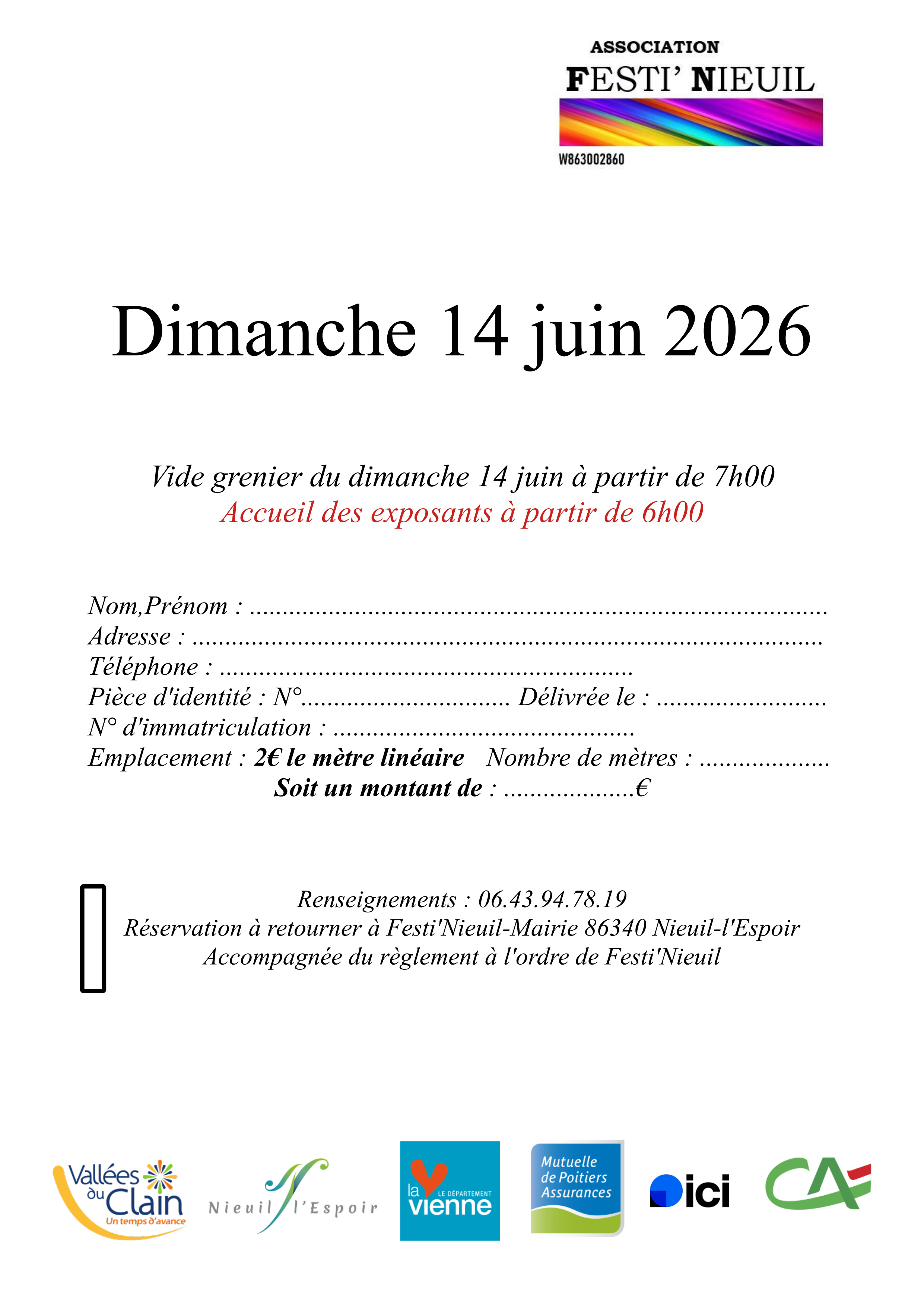 Les personnes souhaitant réserver un emplacement (2€ le mètre linéaire) doivent retourner leur bulletin de réservation à Festi'Nieuil - Mairie, accompagné du règlement à l'ordre de Festi'Nieuil.
