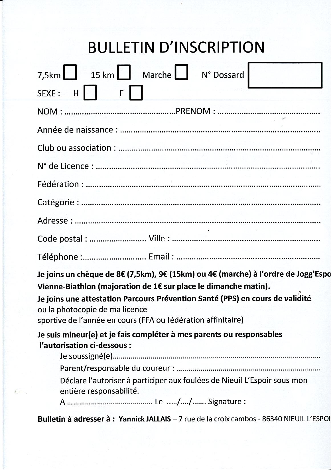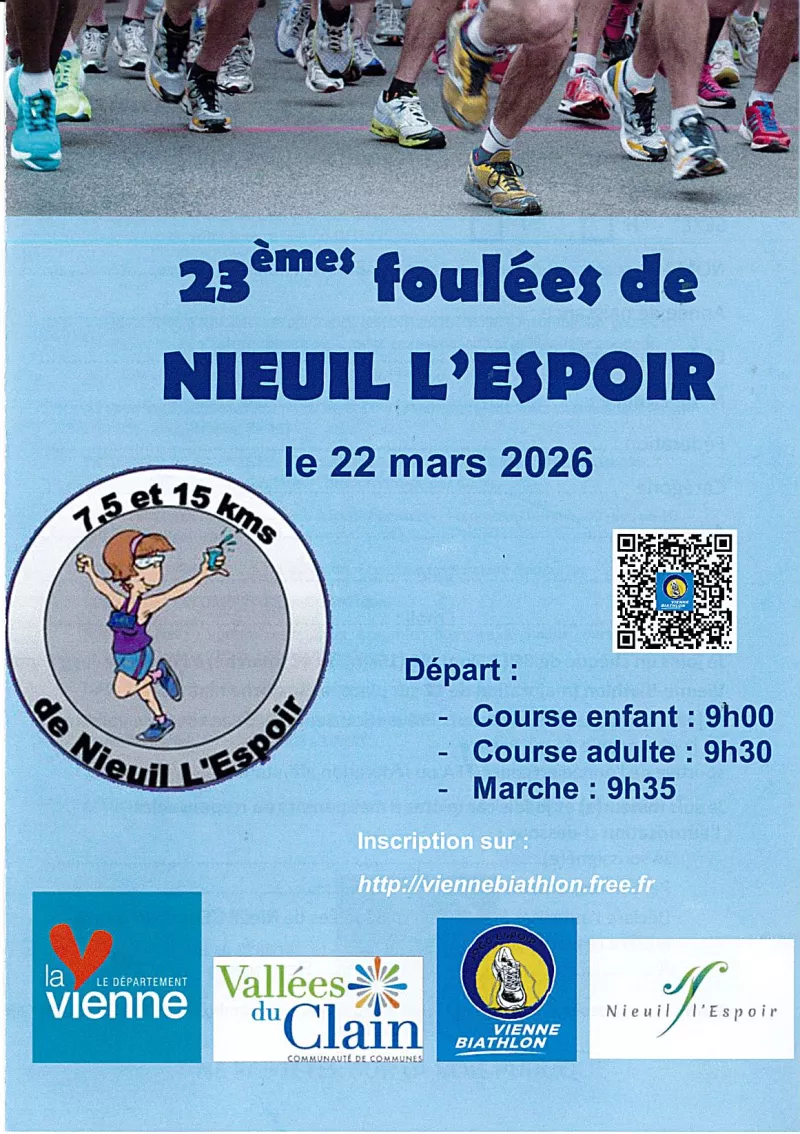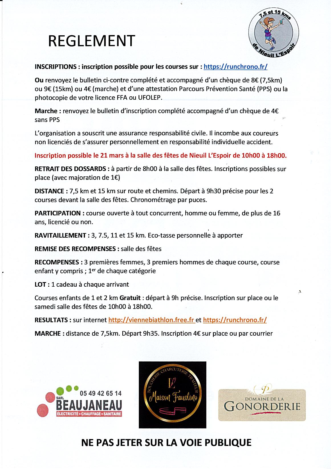 Inscription possible le 21 mars à la salle des fêtes de Nieuil l'Espoir de 10 h à 18 h ou sur https://runchrono.fr