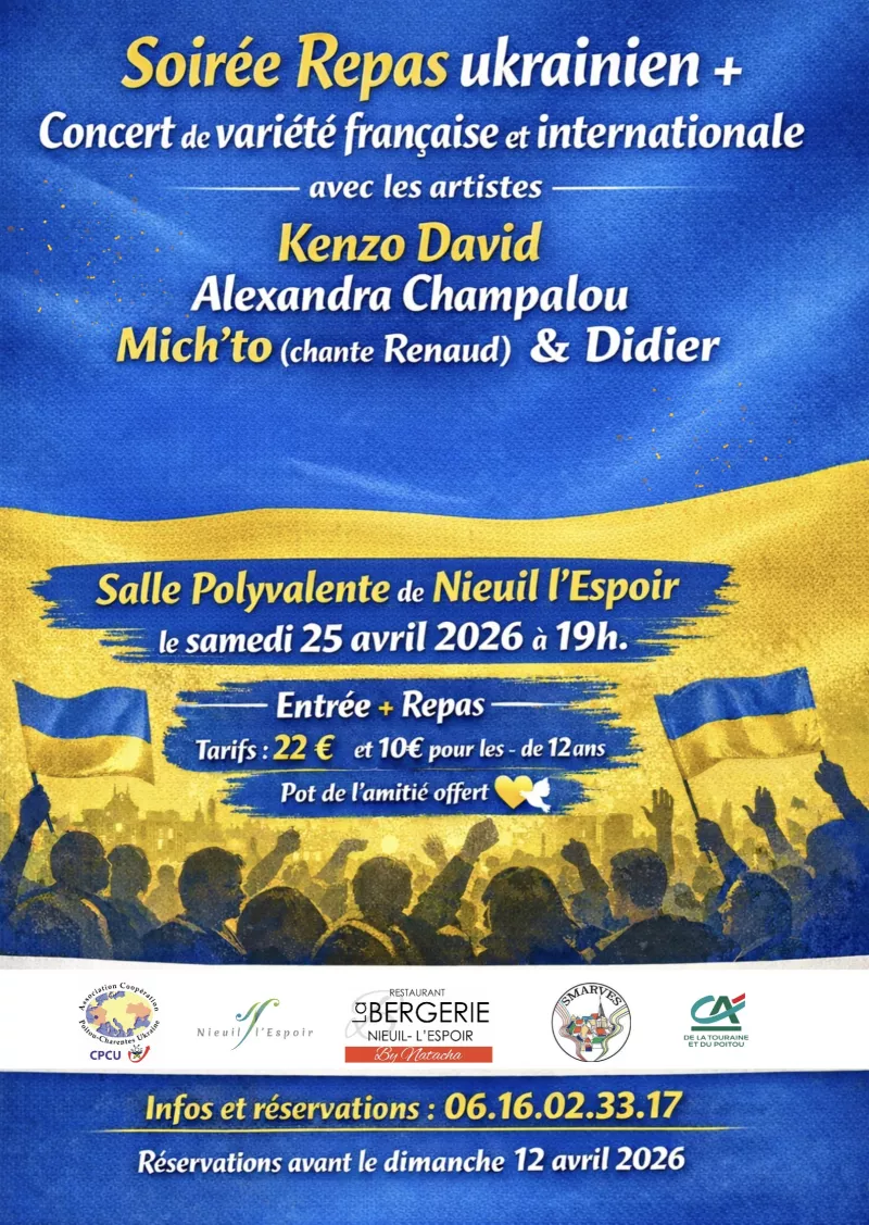Soirée Repas Ukrainien + Concert de variété française et internationale , le samedi 25 avril 2026, à 19 h 00, Salle Polyvalente à Nieuil L'Espoir.
