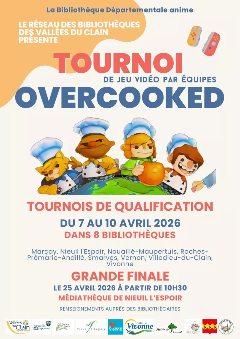 Tournoi de jeu vidéo par équipes Overcooked organisé par le réseau des bibliothèques des Vallées-du-Clain et la Bibliothèque Départementale de la Vienne.