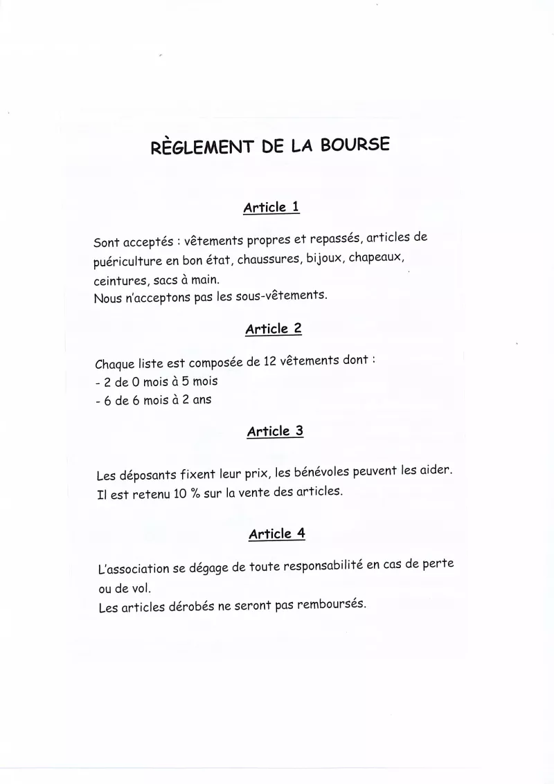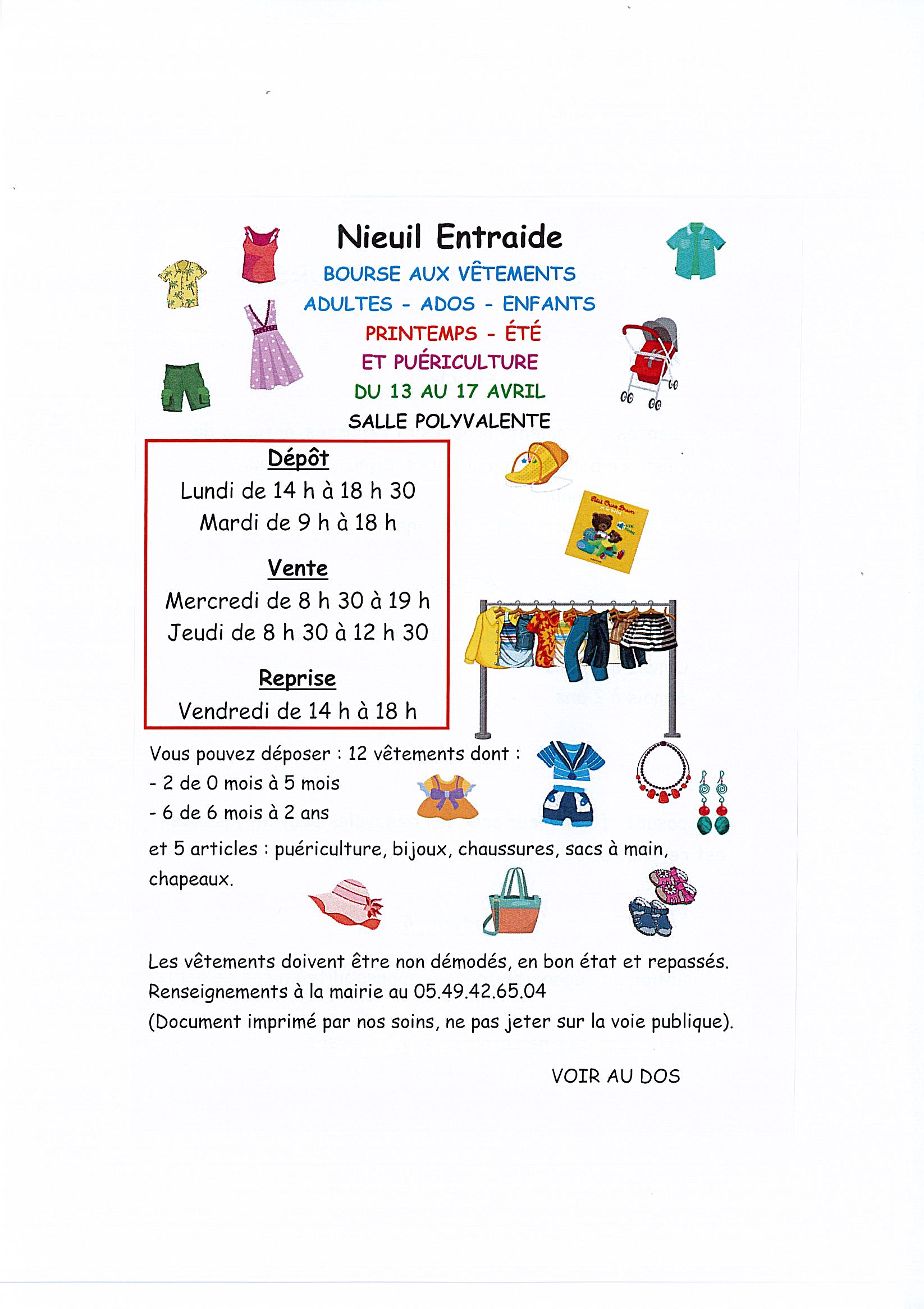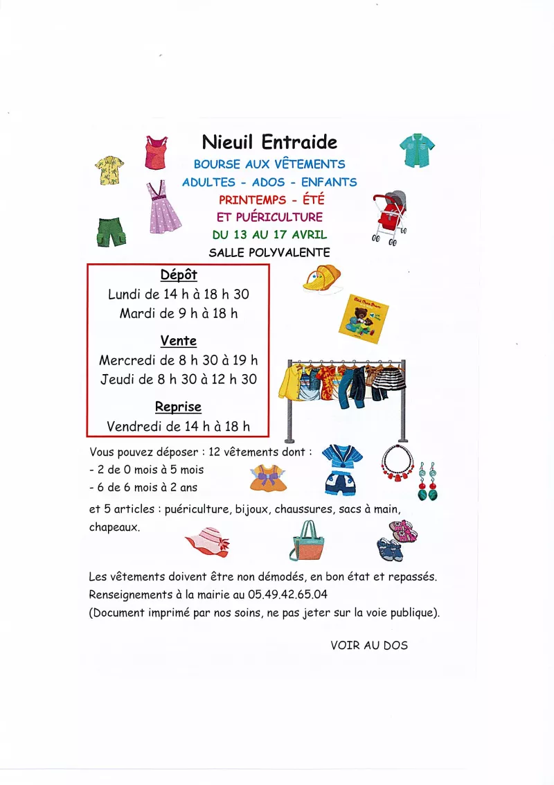L'association Nieuil Entraide organise la Bourse aux vêtements (adultes, adolescents, enfants) et matériels de puériculture -