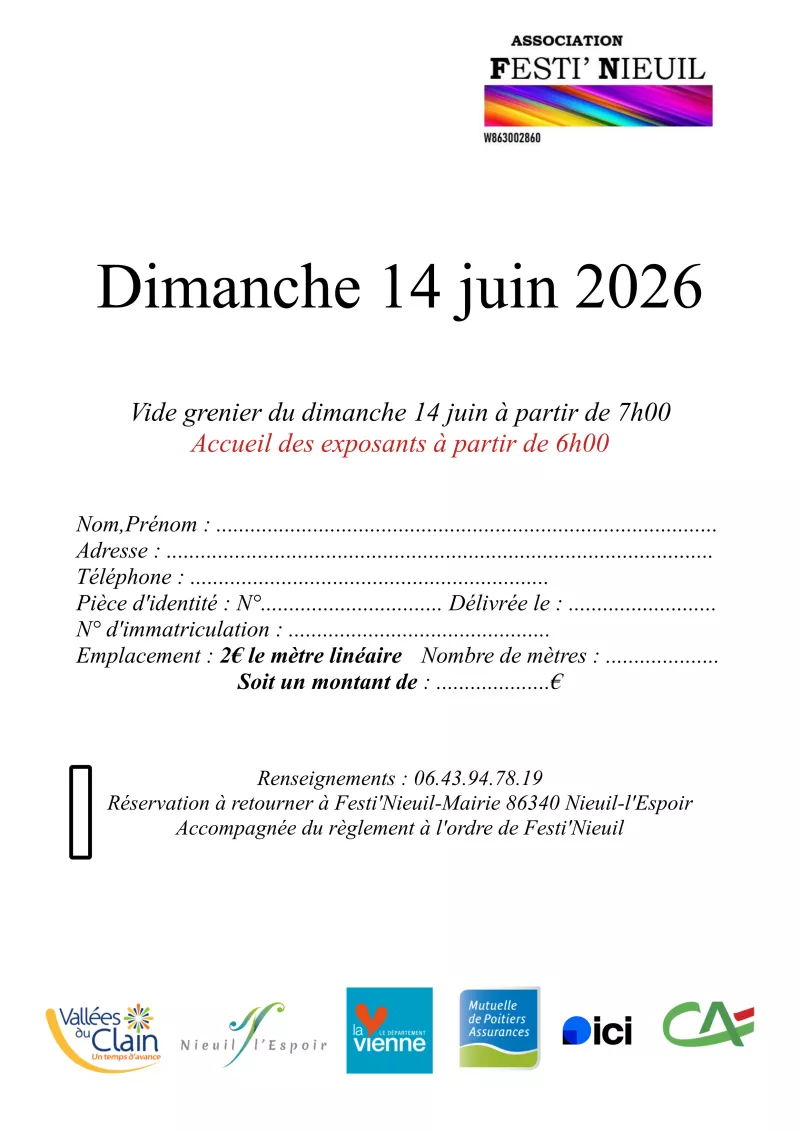 L'association Festi'Nieuil organise son vide grenier annuel le dimanche 14 juin 2026.