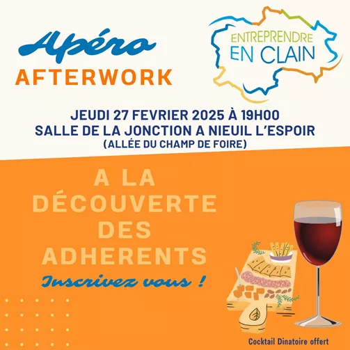 L'association Entreprendre en Clain est heureuse de vous convier à son premier afterwok de l'année "A la découverte des adhérents" le jeudi 27 février à 19 h dans la salle de jonction.